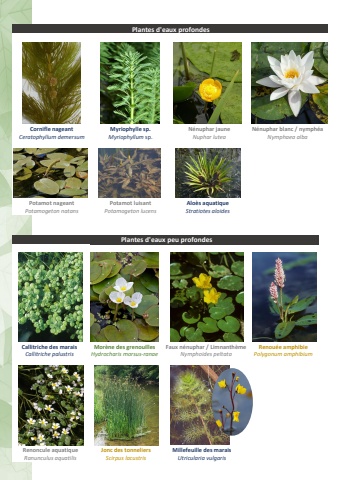 Plantes d'eaux profondesCornifle nageantCeratophyllum demersumMyriophylle sp.Myriophyllum sp.N%u00e9nuphar jaune Nuphar luteaN%u00e9nuphar blanc / nymph%u00e9aNymphaea albaPotamot nageantPotamogeton natansPotamot luisantPotamogeton lucensAlo%u00e8s aquatique Stratiotes aloidesPlantes d'eaux peu profondesCallitriche des marais Callitriche palustrisMor%u00e8ne des grenouilles Hydrocharis morsus-ranaeFaux n%u00e9nuphar / Limnanth%u00e8meNymphoides peltataRenou%u00e9e amphibiePolygonum amphibiumRenoncule aquatiqueRanunculus aquatilisJonc des tonneliersScirpus lacustrisMillefeuille des maraisUtricularia vulgaris