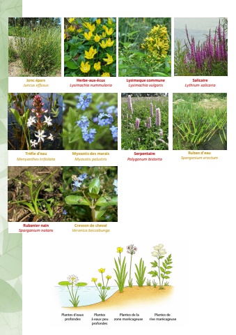 Jonc %u00e9pars Juncus effususHerbe-aux-%u00e9cus Lysimachia nummulariaLysimaque commune Lysimachia vulgarisSalicaire Lythrum salicariaTr%u00e8fle d'eau Menyanthes trifoliataMyosotis des marais Myosotis palustrisSerpentaire Polygonum bistortaRuban d'eau Sparganium erectumRubanier nain Sparganium natansCresson de cheval Veronica beccabunga
