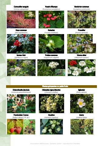 Cornouiller sanguin (Cornus sanguinea)Fusain d%u2019Europe (Euonymus europaeus)Gen%u00e9vrier commun(Juniperus communis)Houx commun (Ilex aquifolium)Noisetier (Corylus avellana)Prunellier(Prunus spinosa)Sureau Noir (Sambucus nigra) Tro%u00e8ne commun (Ligustrum vulgare) Viorne obier(Viburnum opulus) Plantes grimpantes ou petits fruits Ch%u00e8vrefeuille des bois (Lonicera peryclimemum)Cl%u00e9matite vigne-blanche (Clematis vitalba)Eglantier (Rosa canina)Framboisier / ronce (Rubus ideaus / R. sp.)Houblon (Humulus lupulus)Lierre (Hedera helix) Association ABEILocales, Tiphaine Coillot - reproduction interdite -