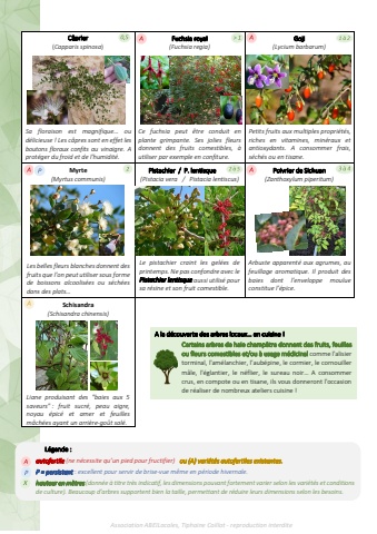 C%u00e2prier (Capparis spinosa)Sa floraison est magnifique%u2026 ou d%u00e9licieuse ! Les c%u00e2pres sont en effet les boutons floraux confits au vinaigre. A prot%u00e9ger du froid et de l%u2019humidit%u00e9.Fuchsia royal (Fuchsia regia)Ce fuchsia peut %u00eatre conduit en plante grimpante. Ses jolies fleurs donnent des fruits comestibles, %u00e0 utiliser par exemple en confiture.Goji (Lycium barbarum)Petits fruits aux multiples propri%u00e9t%u00e9s, riches en vitamines, min%u00e9raux et antioxydants. A consommer frais, s%u00e9ch%u00e9s ou en tisane.Myrte (Myrtus communis)Les belles fleurs blanches donnent des fruits que l%u2019on peut utiliser sous forme de boissons alcoolis%u00e9es ou s%u00e9ch%u00e9es dans des plats%u2026 Pistachier / P. lentisque (Pistacia vera / Pistacia lentiscus)Le pistachier craint les gel%u00e9es de printemps. Ne pas confondre avec le Pistachier lentisque aussi utilis%u00e9 pour sa r%u00e9sine et son fruit comestible.Poivrier de Sichuan (Zanthoxylum piperitum)Arbuste apparent%u00e9 aux agrumes, au feuillage aromatique. Il produit des baies dont l%u2019enveloppe moulue constitue l%u2019%u00e9pice.Schisandra (Schisandra chinensis)Liane produisant des \saveurs\noyau %u00e9pic%u00e9 et amer et feuilles m%u00e2ch%u00e9es ayant un arri%u00e8re-go%u00fbt sal%u00e9. L%u00e9gende : autofertile (ne n%u00e9cessite qu%u2019un pied pour fructifier) ou (A) vari%u00e9t%u00e9s autofertiles existantes. P = persistant : excellent pour servir de brise-vue m%u00eame en p%u00e9riode hivernale.hauteur en m%u00e8tres(donn%u00e9e %u00e0 titre tr%u00e8s indicatif, les dimensions pouvant fortement varier selon les vari%u00e9t%u00e9s et conditions de culture). Beaucoup d%u2019arbres supportent bien la taille, permettant de r%u00e9duire leurs dimensions selon les besoins. A la d%u00e9couverte des arbres locaux%u2026 en cuisine ! Certains arbres de haie champ%u00eatre donnent des fruits, feuilles ou fleurs comestibles et/ou %u00e0 usage m%u00e9dicinal comme l'alisier torminal, l'am%u00e9lanchier, l%u2019aub%u00e9pine, le cormier, le cornouillerm%u00e2le, l'%u00e9glantier, le n%u00e9flier, le sureau noir%u2026 A consommer crus, en compote ou en tisane, ils vous donneront l'occasion de r%u00e9aliser de nombreux ateliers cuisine !Association ABEILocales, Tiphaine Coillot - reproduction interdite -