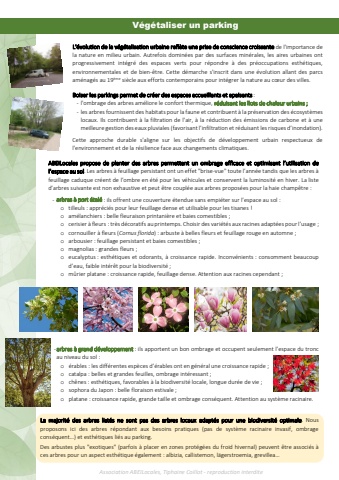 V%u00e9g%u00e9taliser un parking L'%u00e9volution de la v%u00e9g%u00e9talisation urbaine refl%u00e8te une prise de conscience croissante de l'importance de la nature en milieu urbain. Autrefois domin%u00e9es par des surfaces min%u00e9rales, les aires urbaines ont progressivement int%u00e9gr%u00e9 des espaces verts pour r%u00e9pondre %u00e0 des pr%u00e9occupations esth%u00e9tiques, environnementales et de bien-%u00eatre. Cette d%u00e9marche s'inscrit dans une %u00e9volution allant des parcs am%u00e9nag%u00e9s au 19%u00e8me si%u00e8cle aux efforts contemporains pour int%u00e9grer la nature au c%u0153ur des villes.Boiser les parkings permet de cr%u00e9er des espaces accueillants et apaisants :- l'ombrage des arbres am%u00e9liore le confort thermique, r%u00e9duisant les %u00eelots de chaleur urbains ;- les arbres fournissent des habitats pour la faune et contribuent %u00e0 la pr%u00e9servation des %u00e9cosyst%u00e8mes locaux. Ils contribuent %u00e0 la filtration de l'air, %u00e0 la r%u00e9duction des %u00e9missions de carbone et %u00e0 une meilleure gestion des eaux pluviales (favorisant l%u2019infiltration et r%u00e9duisant les risques d%u2019inondation). Cette approche durable s'aligne sur les objectifs de d%u00e9veloppement urbain respectueux de l'environnement et de la r%u00e9silience face aux changements climatiques.ABEILocales propose de planter des arbres permettant un ombrage efficace et optimisant l%u2019utilisation de l%u2019espace au sol. Les arbres %u00e0 feuillage persistant ont un effet \les arbres %u00e0 feuillage caduque cr%u00e9ent de l%u2019ombre en %u00e9t%u00e9 pour les v%u00e9hicules et conservent la luminosit%u00e9 en hiver. La liste d%u2019arbres suivante est non exhaustive et peut %u00eatre coupl%u00e9e aux arbres propos%u00e9es pour la haie champ%u00eatre :- arbres %u00e0 port %u00e9tal%u00e9 : ils offrent une couverture %u00e9tendue sans empi%u00e9ter sur l%u2019espace au sol :o tilleuls : appr%u00e9ci%u00e9s pour leur feuillage dense et utilisable pour les tisanes !o am%u00e9lanchiers : belle fleuraison printani%u00e8re et baies comestibles ;o cerisier %u00e0 fleurs : tr%u00e8s d%u00e9coratifs au printemps. Choisir des vari%u00e9t%u00e9s aux racines adapt%u00e9es pour l%u2019usage ;o cornouiller %u00e0 fleurs (Cornus florida) : arbuste %u00e0 belles fleurs et feuillage rouge en automne ;o arbousier : feuillage persistant et baies comestibles ;o magnolias : grandes fleurs ;o eucalyptus : esth%u00e9tiques et odorants, %u00e0 croissance rapide. Inconv%u00e9nients : consomment beaucoup d%u2019eau, faible int%u00e9r%u00eat pour la biodiversit%u00e9 ;o m%u00fbrier platane : croissance rapide, feuillage dense. Attention aux racines cependant ;-arbres %u00e0 grand d%u00e9veloppement : ils apportent un bon ombrage et occupent seulement l%u2019espace du tronc au niveau du sol :o %u00e9rables : les diff%u00e9rentes esp%u00e8ces d%u2019%u00e9rables ont en g%u00e9n%u00e9ral une croissance rapide ;o catalpa : belles et grandes feuilles, ombrage int%u00e9ressant ;o ch%u00eanes : esth%u00e9tiques, favorables %u00e0 la biodiversit%u00e9 locale, longue dur%u00e9e de vie ;o sophora du Japon : belle floraison estivale ;o platane : croissance rapide, grande taille et ombrage cons%u00e9quent. Attention au syst%u00e8me racinaire. La majorit%u00e9 des arbres list%u00e9s ne sont pas des arbres locaux adapt%u00e9s pour une biodiversit%u00e9 optimale. Nous proposons ici des arbres r%u00e9pondant aux besoins pratiques (pas de syst%u00e8me racinaire invasif, ombrage cons%u00e9quent%u2026) et esth%u00e9tiques li%u00e9s au parking.Des arbustes plus \soci%u00e9s %u00e0 ces arbres pour un aspect esth%u00e9tique %u00e9galement : albizia, callistemon, l%u00e4gerstroemia, grevillea%u2026Association ABEILocales, Tiphaine Coillot - reproduction interdite -