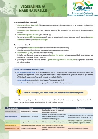 Pourquoi v%u00e9g%u00e9taliser sa mare ?%uf0fc abriter une faune diversifi%u00e9e (abri, zone de reproduction, de nourrissage%u2026) et lui apporter du dioxyg%u00e8ne dissous dans l%u2019eau ;%uf0fc participer %u00e0 un %u00e9cosyst%u00e8me : les v%u00e9g%u00e9taux abritent des insectes, qui nourrissent des amphibiens, oiseaux%u2026 ;%uf0fc am%u00e9liorer la qualit%u00e9 de l%u2019eau (r%u00f4le filtrant%u2026) ;%uf0fc former un ensemble harmonieux avec la mare et les autres %u00e9l%u00e9ments (bois, pierres%u2026), fournir des zones d%u2019ombre %u00e0 la faune, maintenir les berges%u2026Comment proc%u00e9der ?%uf0fc privil%u00e9gier des esp%u00e8ces locales pour accueillir une biodiversit%u00e9 vari%u00e9e ;%uf0fc dans la nature (si l%u00e9gal), lors de troc aux plantes, dans des jardineries%u2026 ;%uf0fc couvrir entre 1/3 et 2/3 de la surface de la mare ;%uf0fc installer les plantes %u00e0 tendance envahissante dans des paniers (ajouter des galets %u00e0 la surface du pot pour %u00e9viter une perte de son contenu) ;%uf0fc pour un plus bel effet, placer les plantes %u00e0 grand d%u00e9veloppement en arri%u00e8re-plan et regrouper les plantes de m%u00eame esp%u00e8ce.Choisir des plantes de diff%u00e9rents types : - de berges et mar%u00e9cages : sols satur%u00e9s en eau. Note : l%u2019am%u00e9nagement d%u2019un marais permet d%u2019accueillir des plantes qui appr%u00e9cient \d%u2019%u00e9liminer le trop-plein d%u2019eau de la mare %u00e0 un endroit d%u00e9fini ;- semi-aquatiques : enracin%u00e9es dans la vase / immersion partielle ;- aquatiques : flottantes ou immerg%u00e9es, adapt%u00e9es %u00e0 diff%u00e9rentes profondeurs.Pour en savoir plus, voir notre livret \Les tableaux ci-apr%u00e8s pr%u00e9sentent une liste non exhaustive de plantes locales, par cat%u00e9gorie de profondeur d%u2019eau. Le type de plante est repr%u00e9sent%u00e9 par le code couleur suivant :Type de plante Eaux Observation Pr%u00e9cautionsfeuillage flottant peu profondes %u00e0 profondes Feuilles %u00e0 la surface de l'eau mais enracin%u00e9es dans le sol.feuillage immerg%u00e9 peu profondes %u00e0 profondesPlantes en g%u00e9n%u00e9ral %u00e0 feuillage fin et dense, oxyg%u00e9nantes, %u00e0 croissance rapide, limitant les algues.Eviter de surpeupler pour ne pas avoir trop de production nocturne de CO 2.nageantes peu profondes %u00e0 profondes Plantes %u00e0 racines ET feuillage flottants. Limiter leur expansion : garder libre 2/3 ou 3/4 de la surface de la mare.feuillage %u00e9merg%u00e9 mar%u00e9cageuses %u00e0 peu profondes Pied immerg%u00e9, feuillage a%u00e9rien.vivaces de bord d'eau sol frais ou mar%u00e9cageux Plantes pour sol frais, l%u00e9g%u00e8rement humide. Planter %u00e0 proximit%u00e9 de la mare.VEGETALISER SA MARE NATURELLE